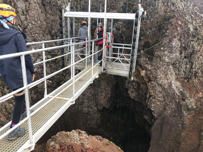 We were snapped in to the lift, which was kind of like a window washer’s scaffold, and lowered 120 meters (approximately 38 stories) to the crater floor. The entire descent took a little over five minutes.
