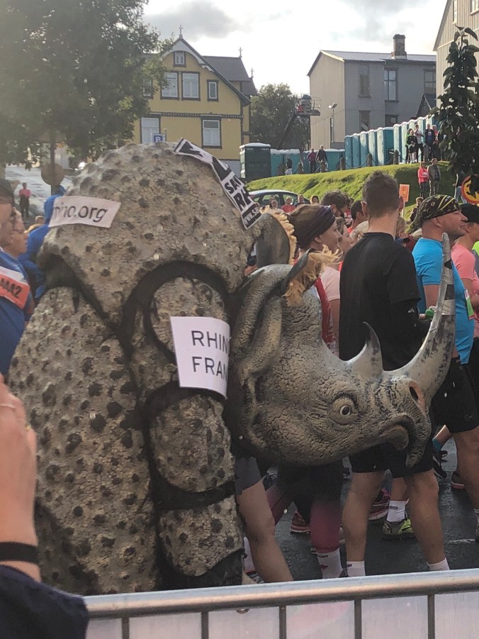 In almost perfect weather (spitting just a little rain and 50 degrees) he joined over 4000 other runners from over 80 countries. One runner was even dressed as a rhinoceros with a plea to savetherhino.org.