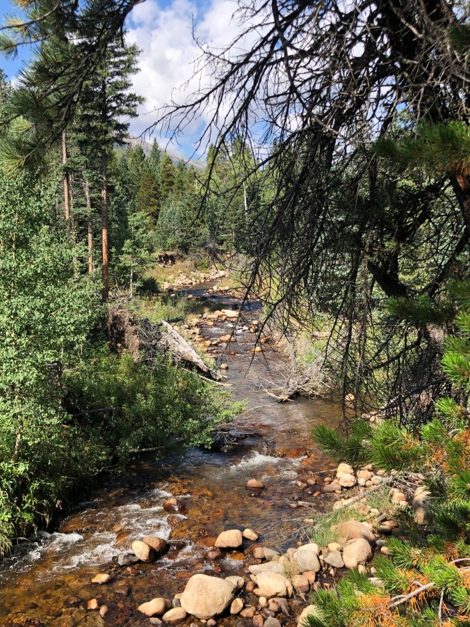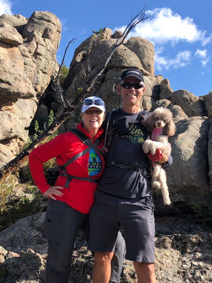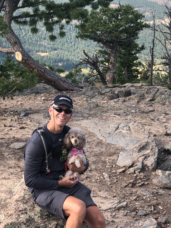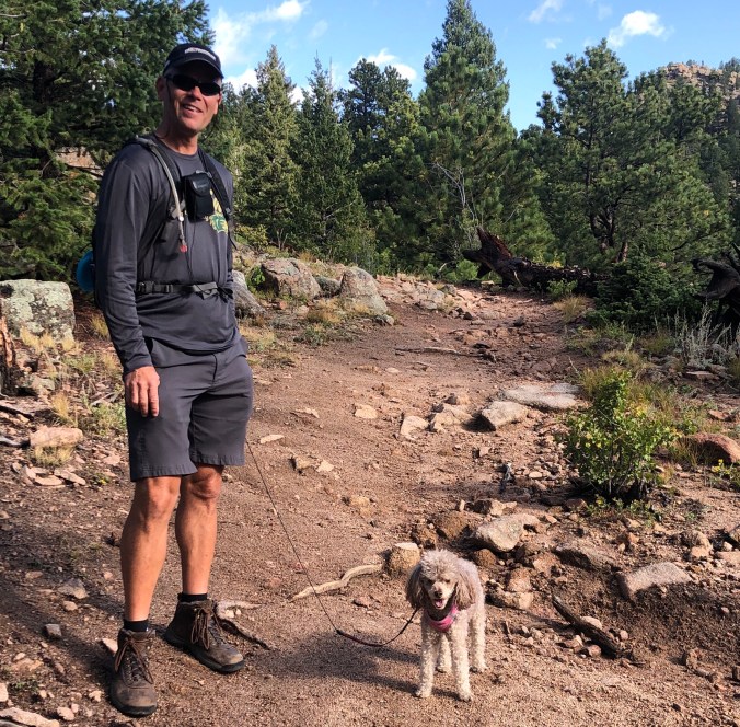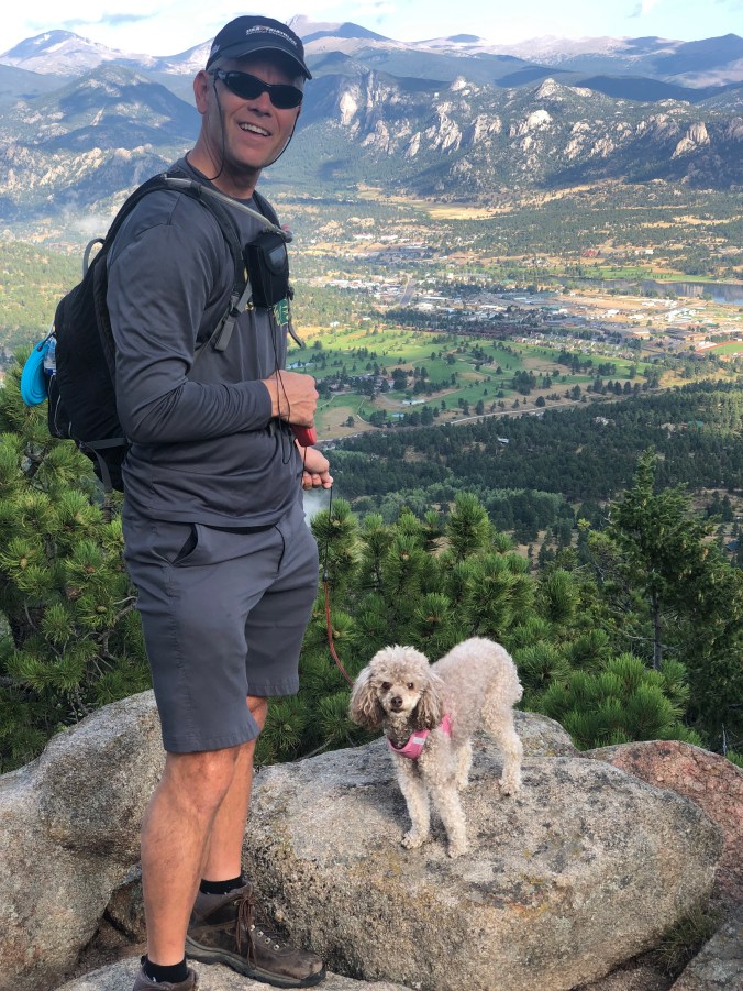 After a fun weekend we headed to the mountains and Estes Park. Mia loved staying in our little cabin at the Castle Mountain Resort, on the banks of the Fall River and just three miles from the entrance to Rocky Mountain National Park. While Mia could go into the park, she wasn’t allowed on the trails. So, we did our hiking outside of the park. One day we hiked Kruger Rock, which provided an overlook of Cheley Colorado Camps, where Steve and I met over 33 years ago.