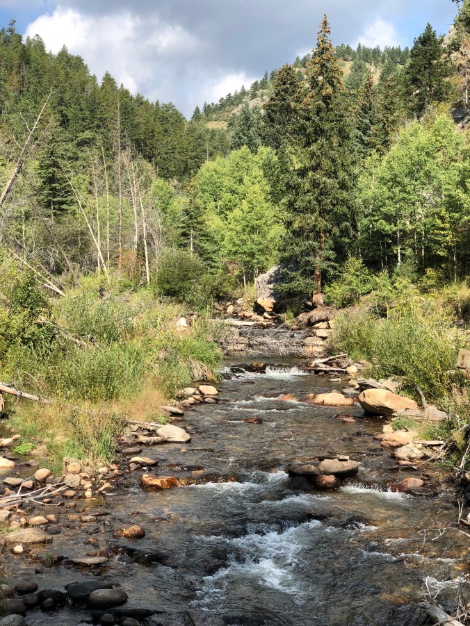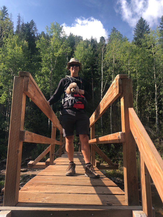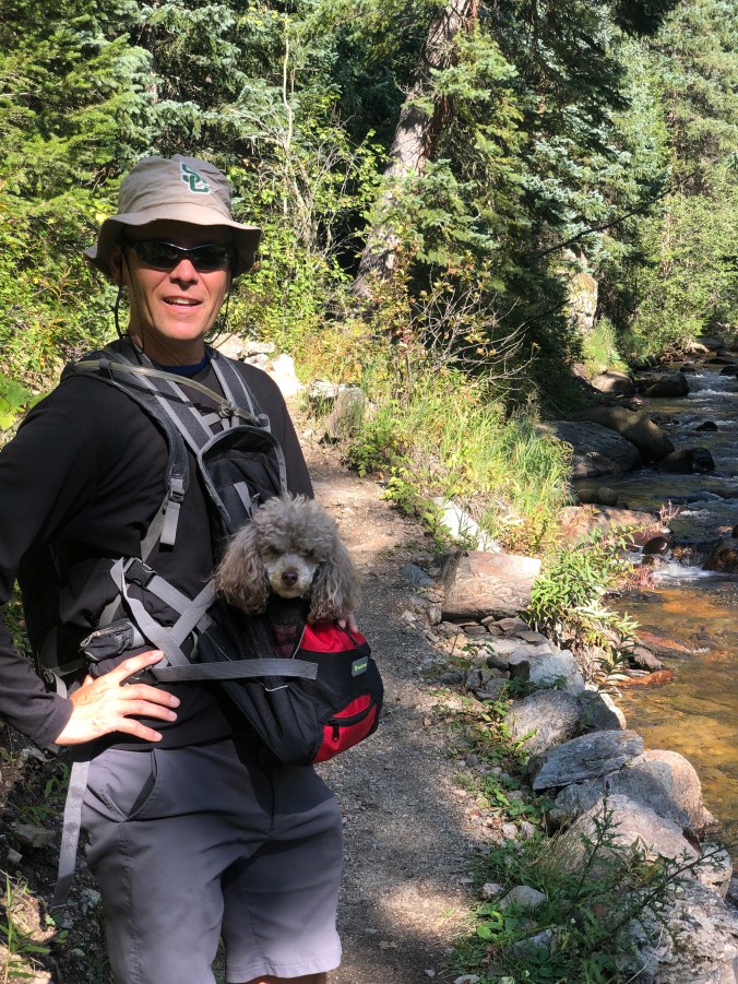 We also hiked the North Fork of the Big Thompson River. Mia rode in the pack the entire 5+ mile hike since this area was heavily wooded. We were warned of ticks in the area, so we played it safe.