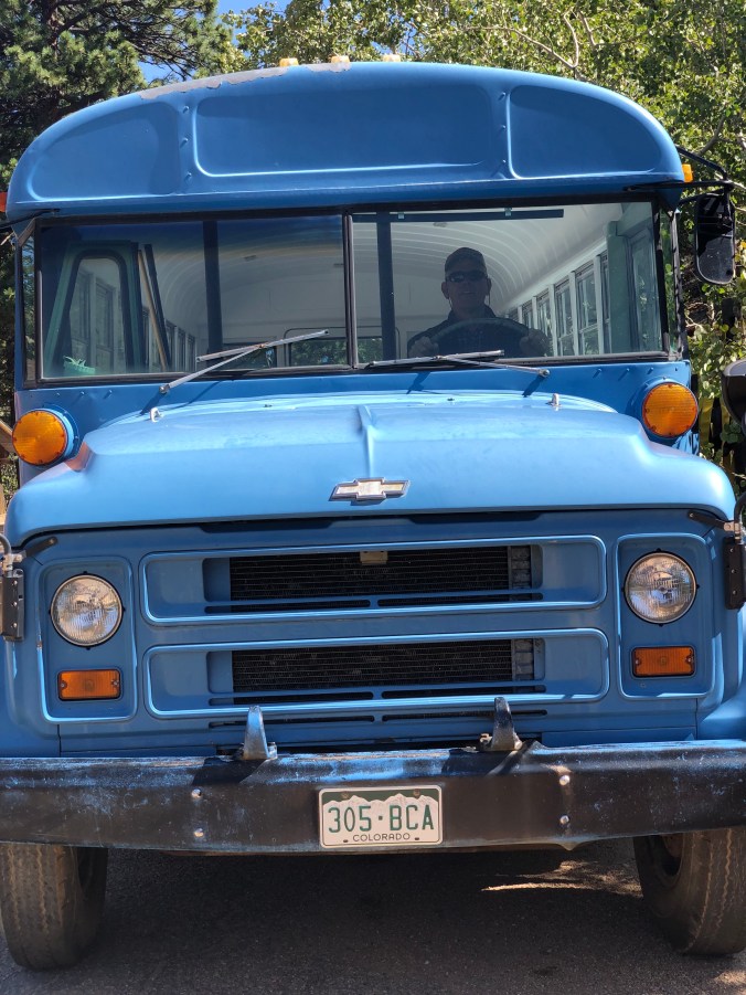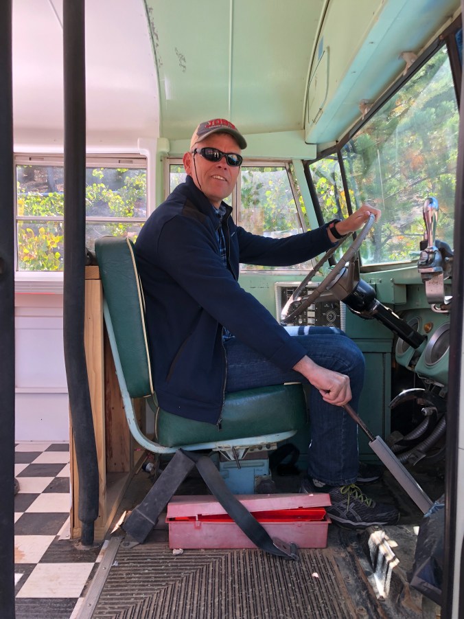 Check out Steve behind the wheel of his old blue bus!