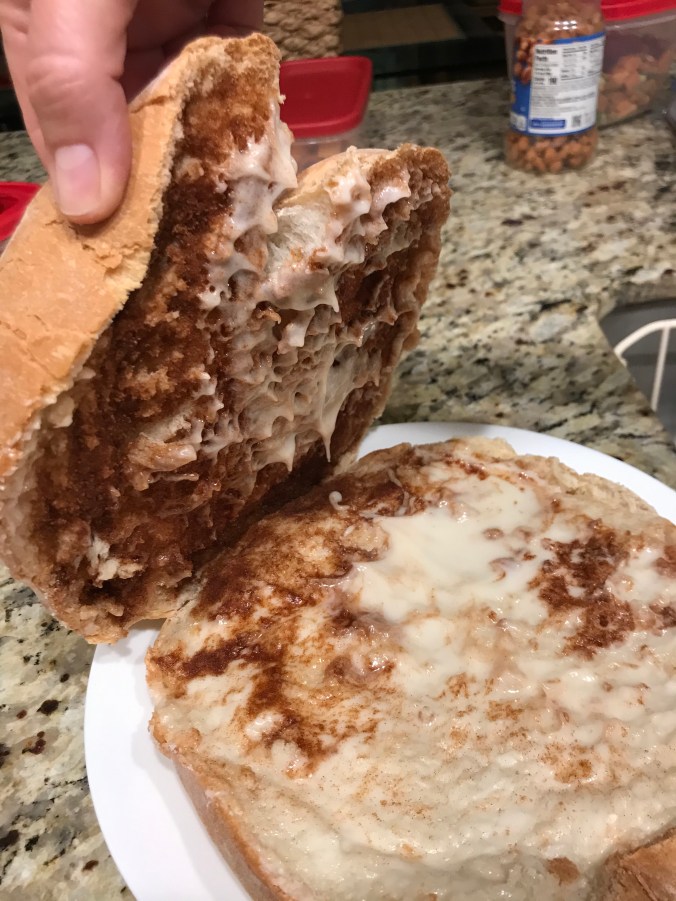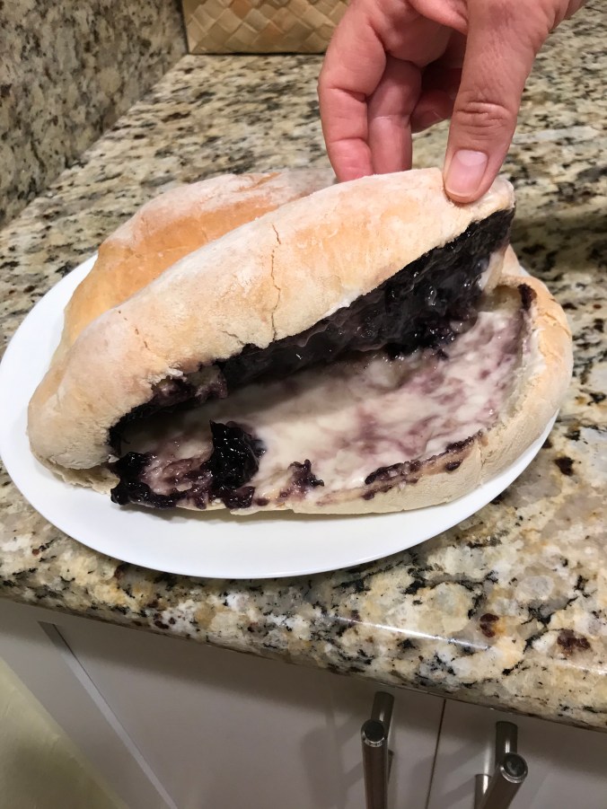 We’ll, it’s a large pillow of soft bread stuffed with your choice of fillings, usually with cream cheese. We got one with blueberry and one with cinnamon and sugar.