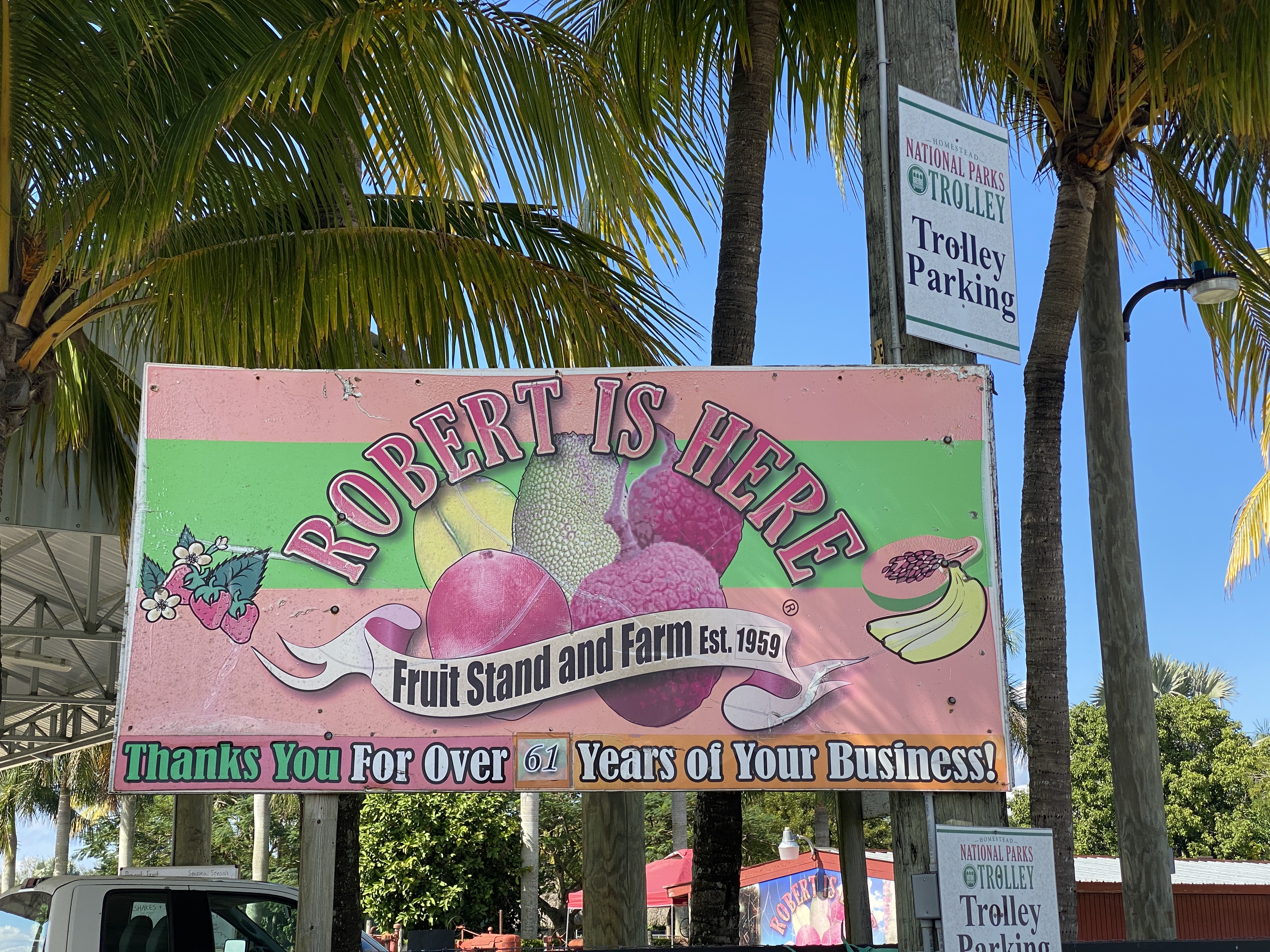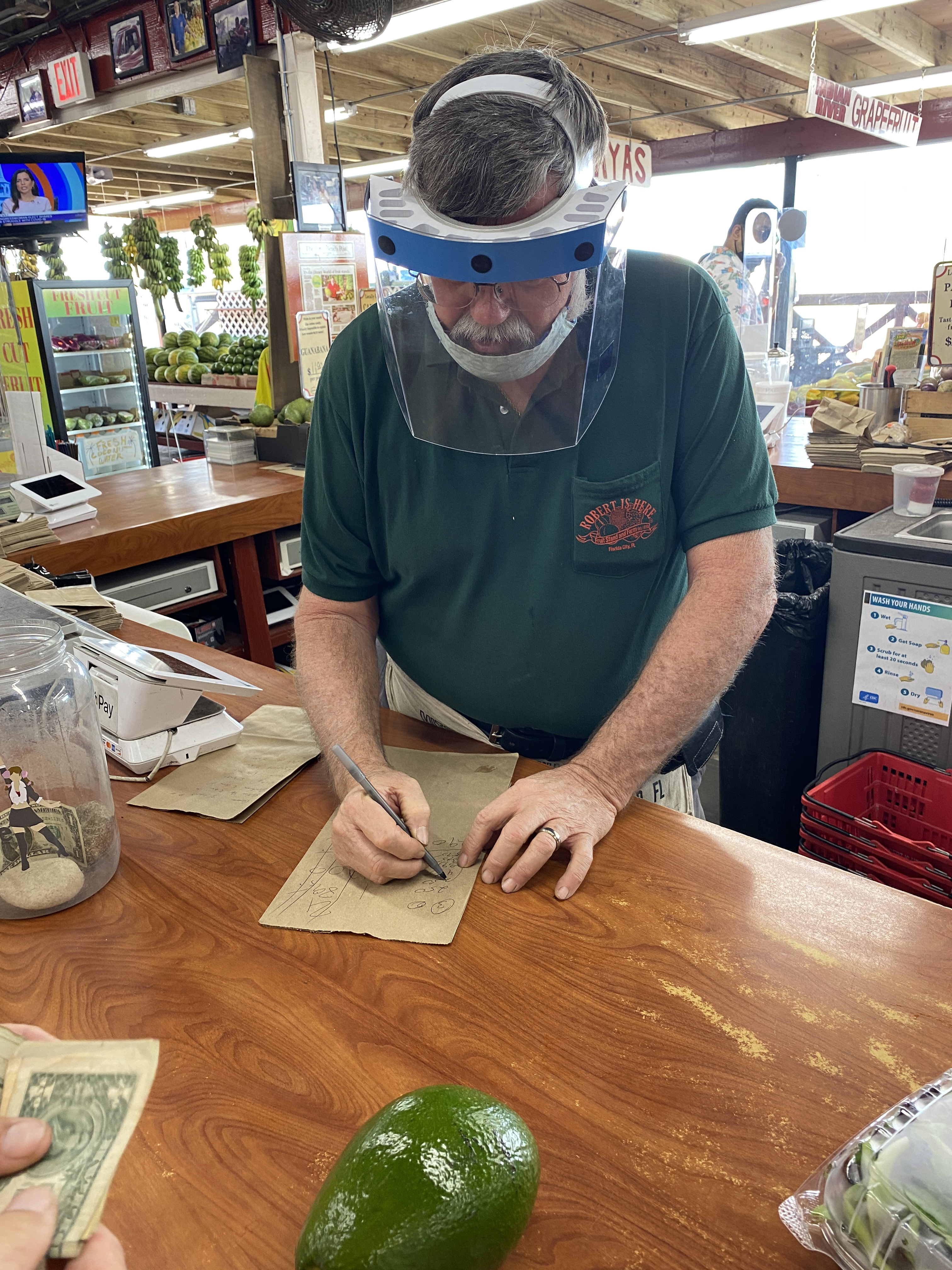 We also stopped at the legendary fruit stand Robert is Here. Since the 50s Robert has been selling produce, much of it exotic, and delicious fruit shakes. We bought the largest avocado we’ve ever seen, along with other goodies. Robert rang us up at the register by calculating our bill by hand on the back of a paper sack. Fun stop!