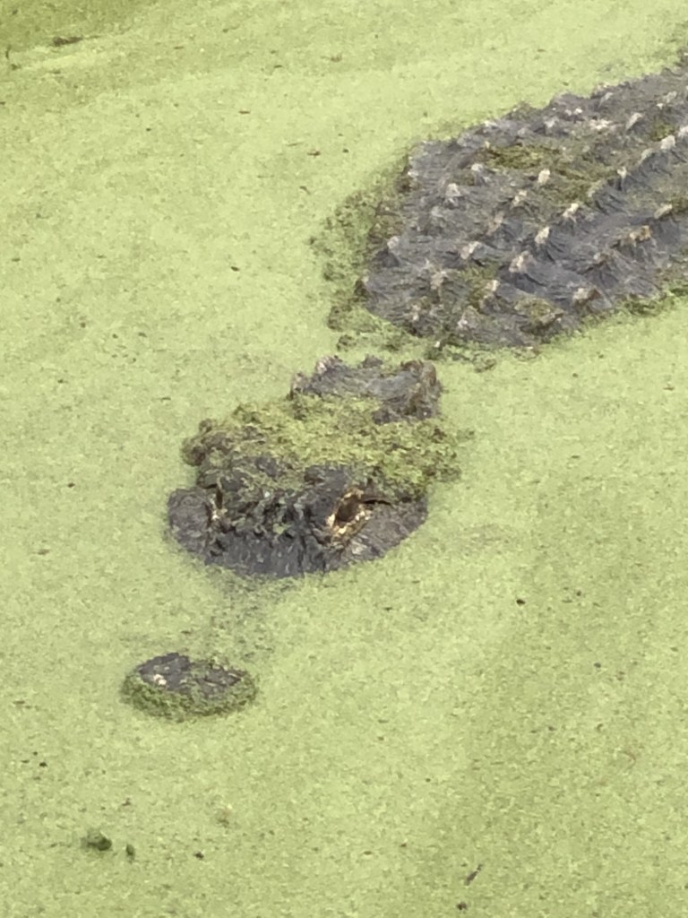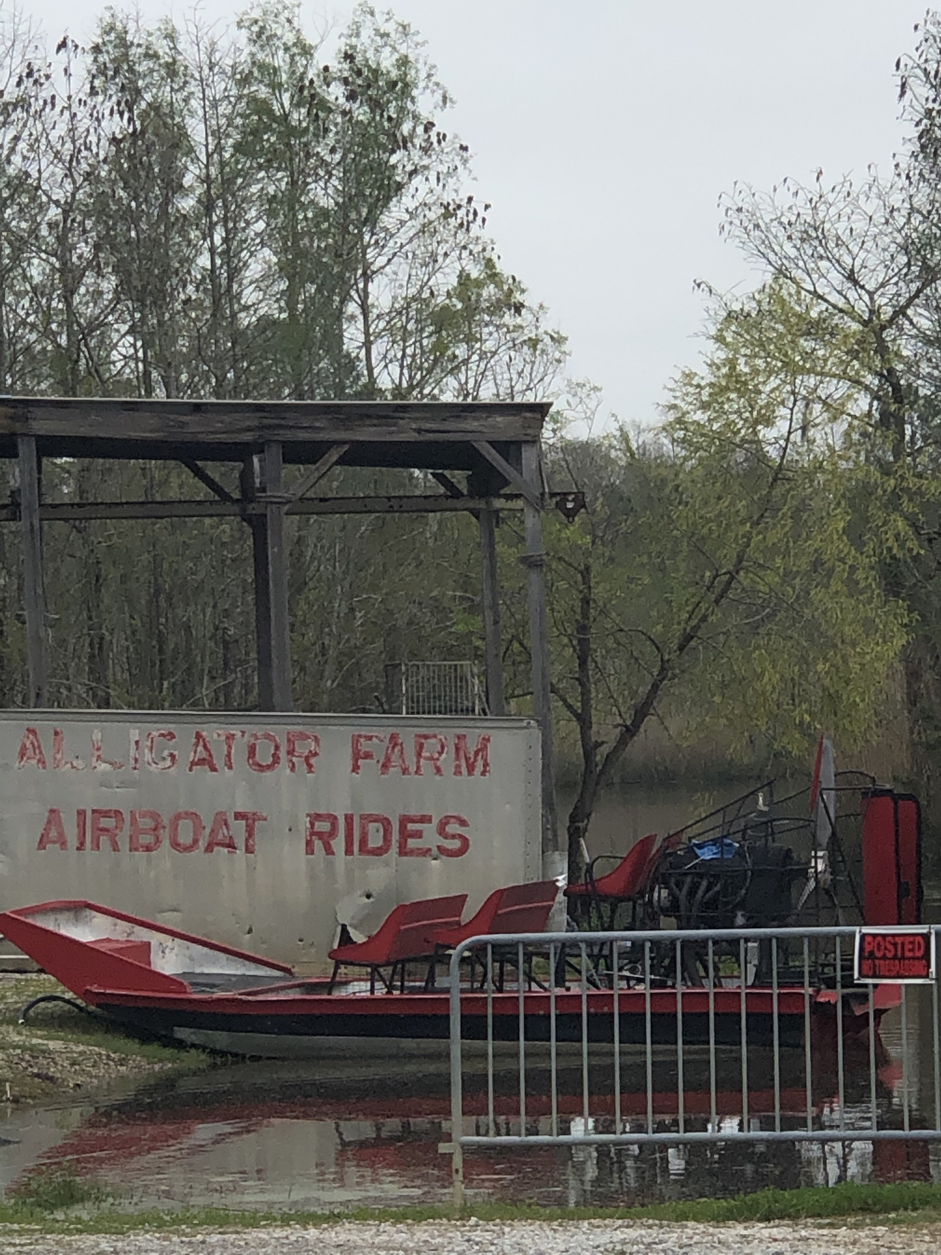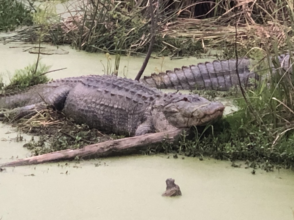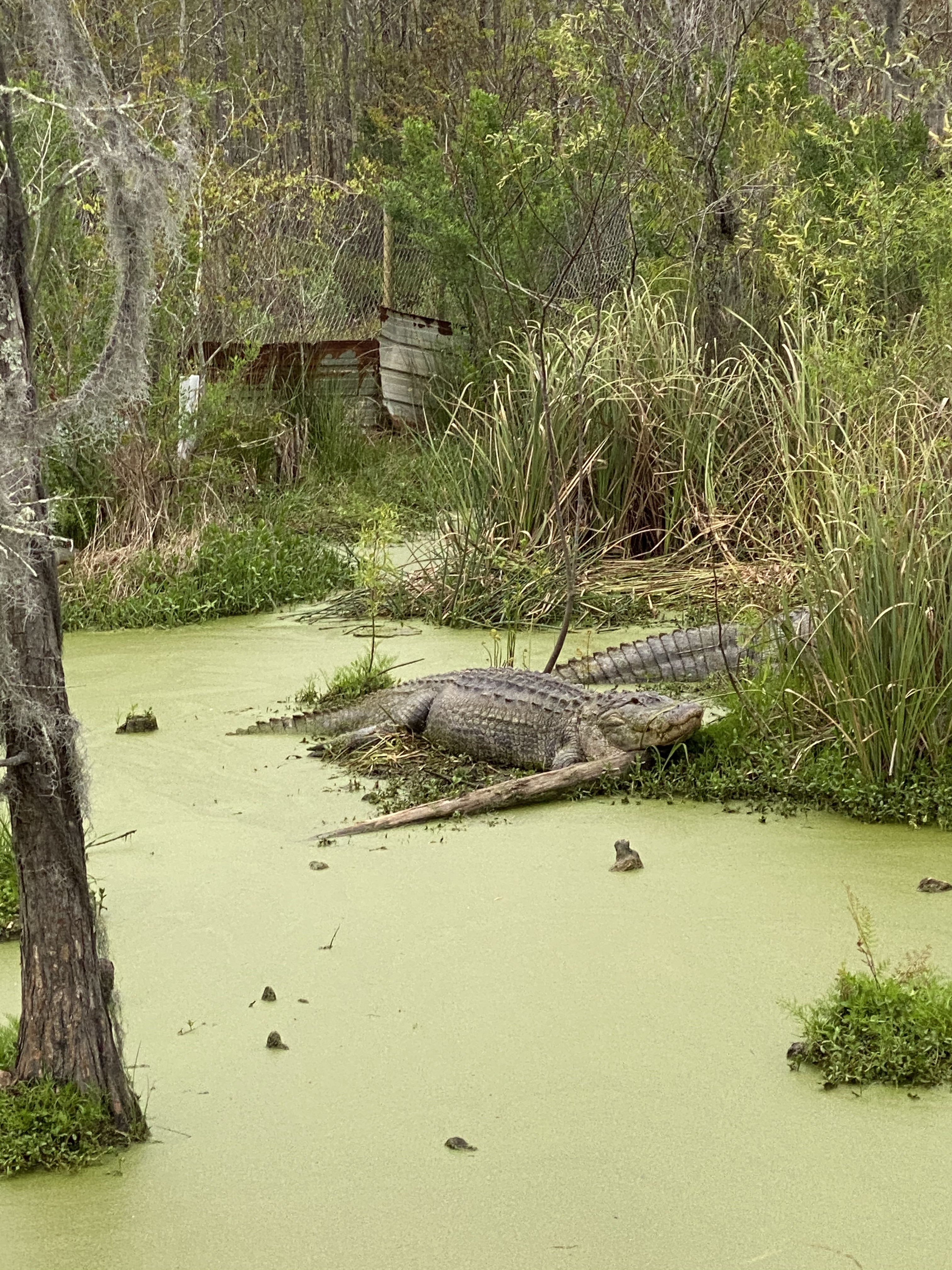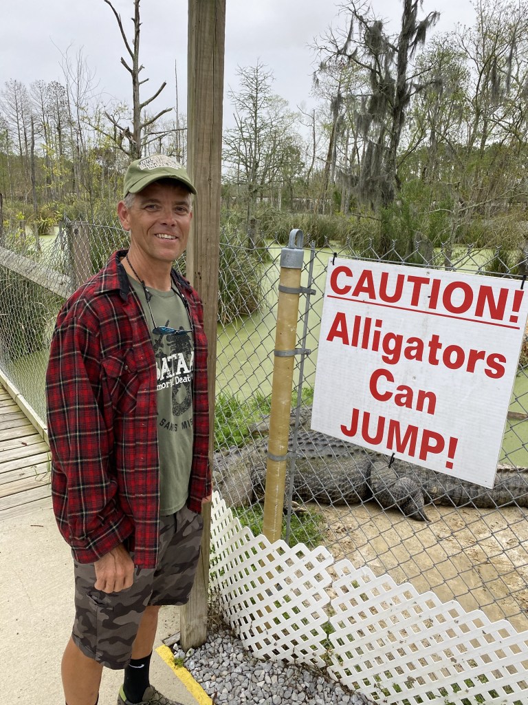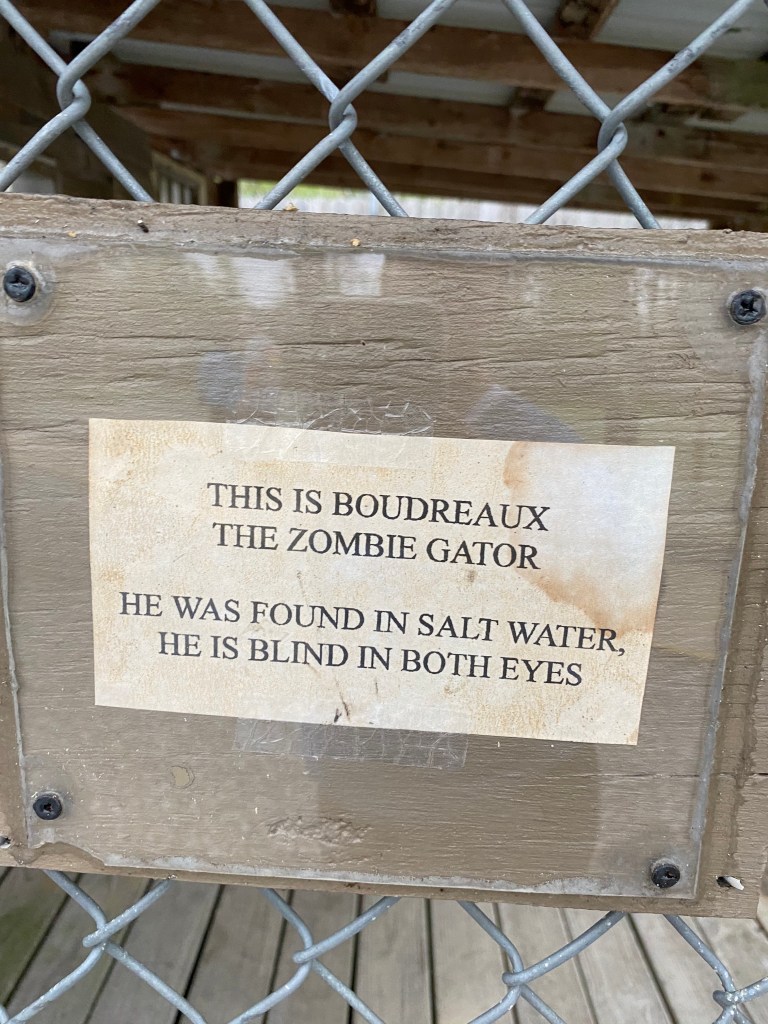 A few days later, while continuing our traverse westward, we stopped for the night at Gulf Coast Gator Ranch in Moss Point, MS. Yes, we parked right next to Boudreaux’s enclosure, home of the 13 foot alligator. It was a bit disconcerting until we learned he was “friendly” and blind.
