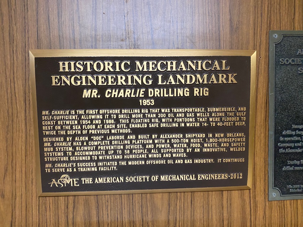 “Mr. Charlie” is the first offshore drilling rig that was transportable, submersible, and self-sufficient, allowing it to drill more than 200 oil wells along the Gulf Coast between 1954 and 1986. Mr. Charlie was the first moveable rig and has been preserved for training and educational purposes.
