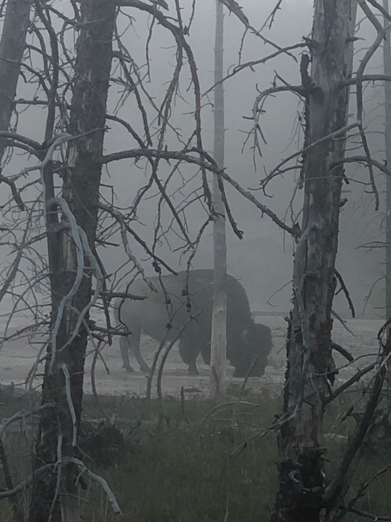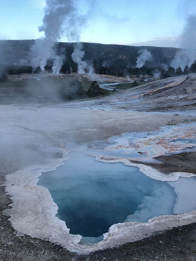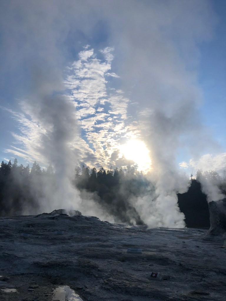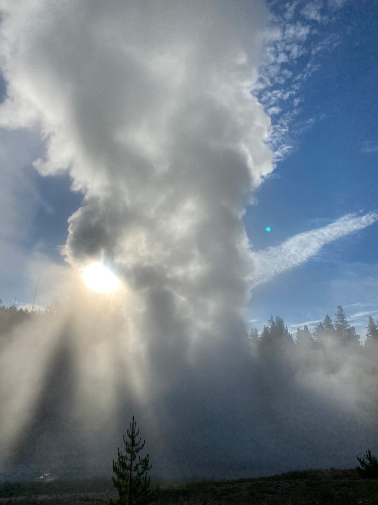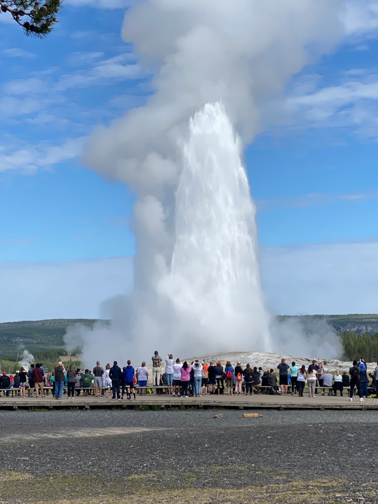Our viewing of Old Faithful’s eruption about 30 minutes later was a little anti-climactic, to say the least. Still, we enjoyed the ritual with Mia and Bob by our side.