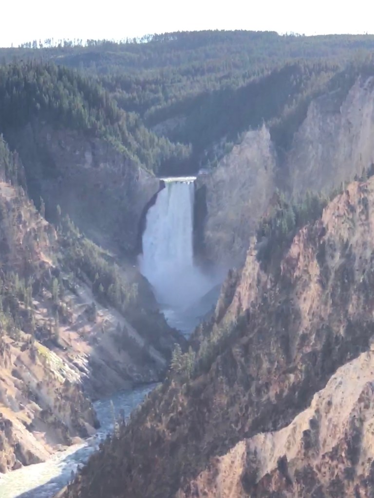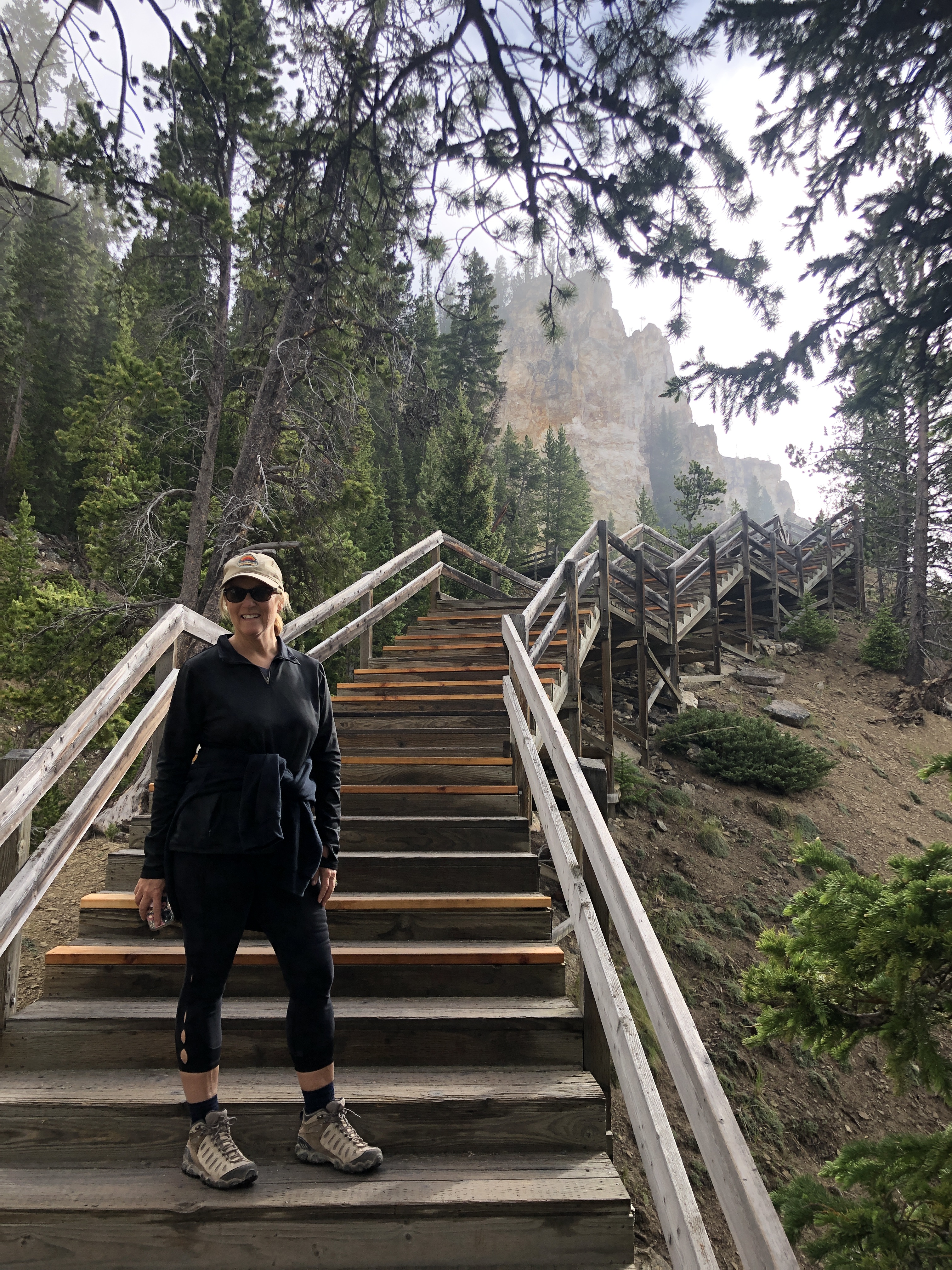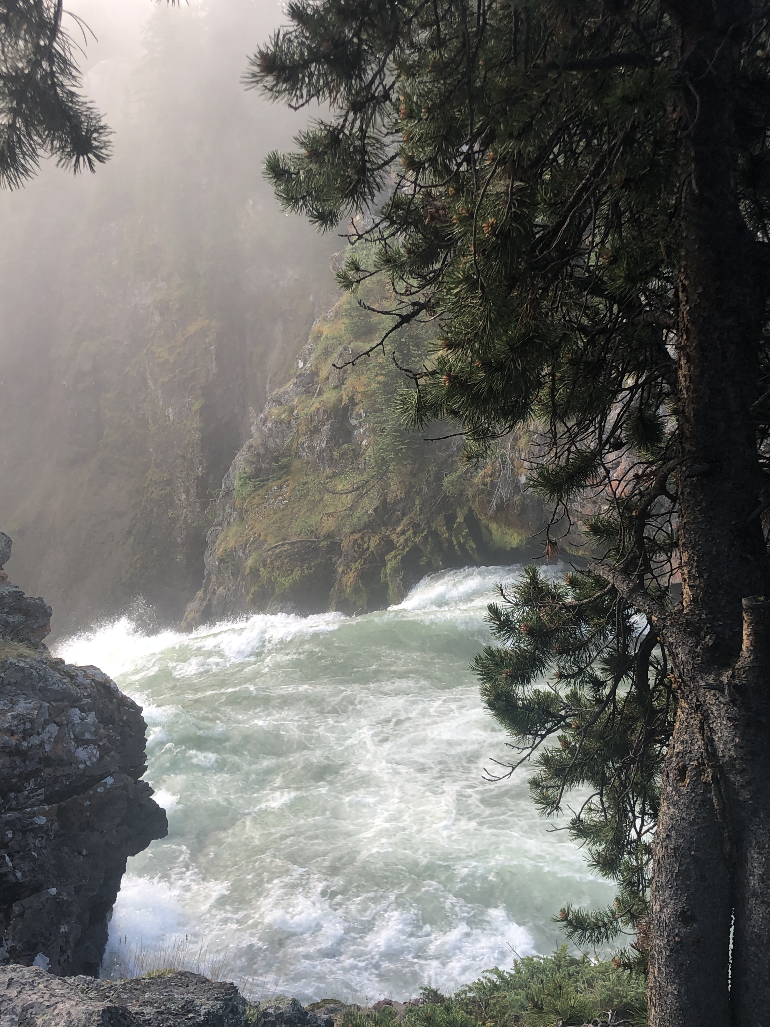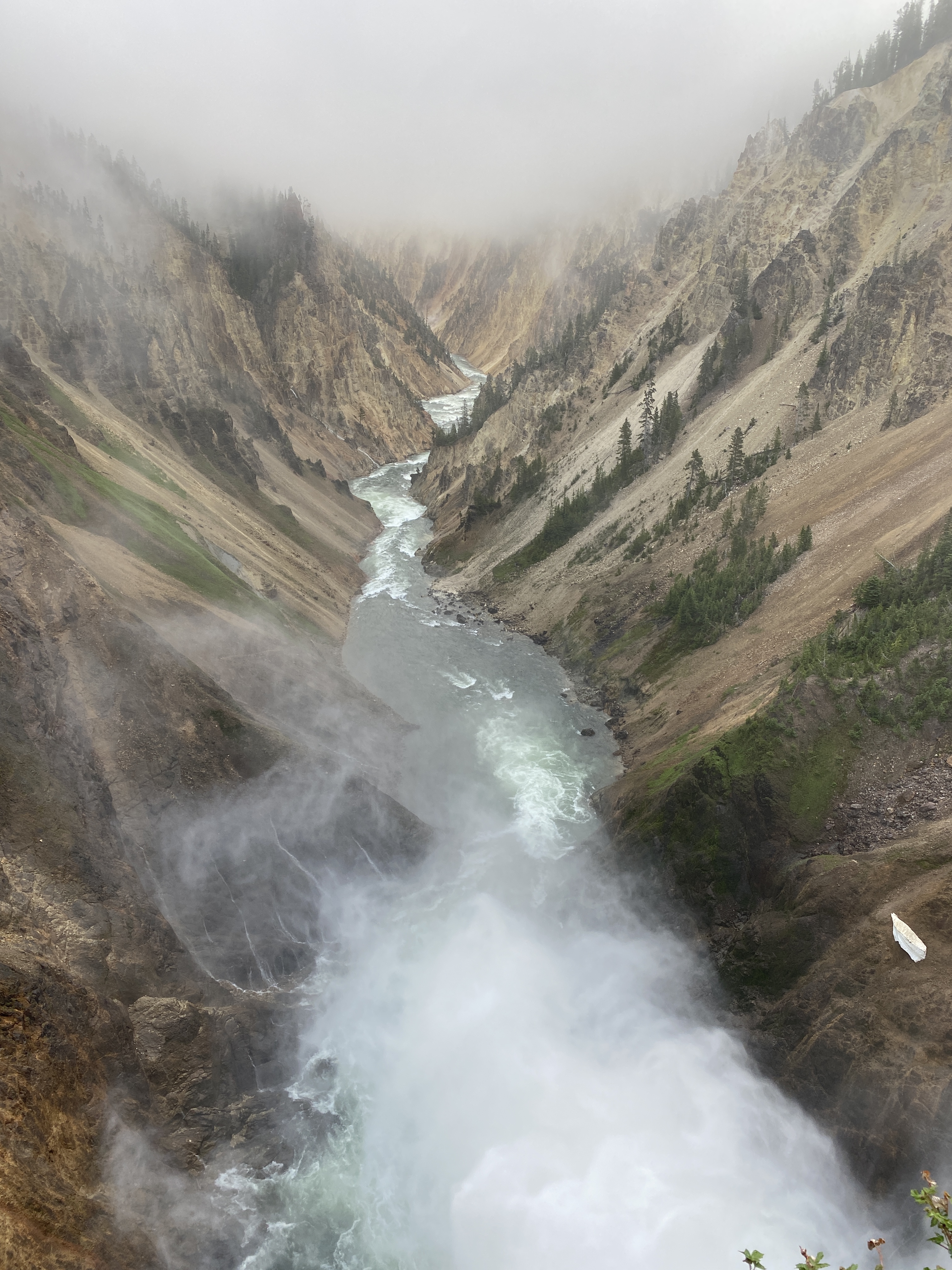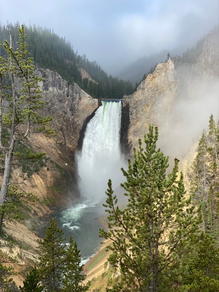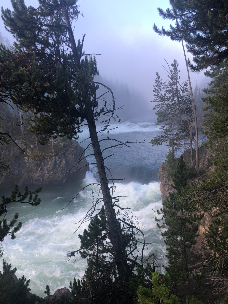 Once again, we arrived in the early morning to avoid the crowds and it was a good idea. In fact, at some overlooks we were the only people there! The early morning mist and low hanging clouds also added to the dramatic atmosphere. The Grand Canyon of the Yellowstone is punctuated by two massive falls–upper and lower. Each fall has a trail that take you down over 500 feet to the brink of the falls. We did both.