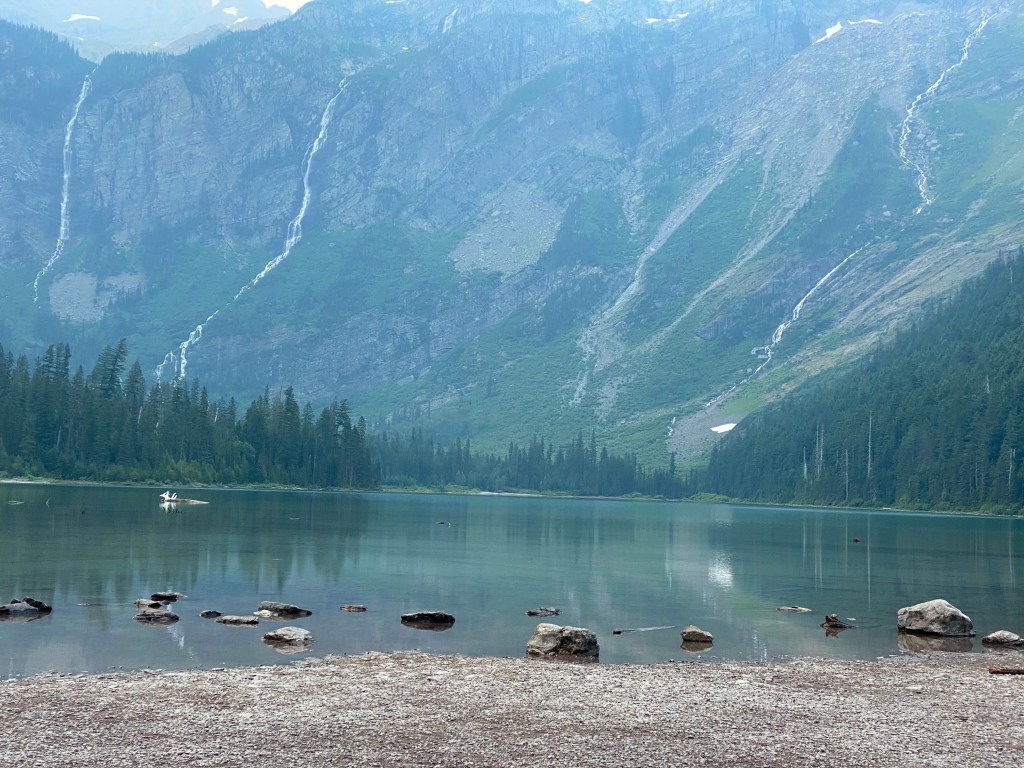 Three waterfalls in distance, serene water, and complete quiet except for the birds made this one of the most special 15 minutes we’ve had in a long time. By the time we began our hike back to the trailhead there were crowds of people making their way to the lake. We considered ourselves lucky for what we experienced.