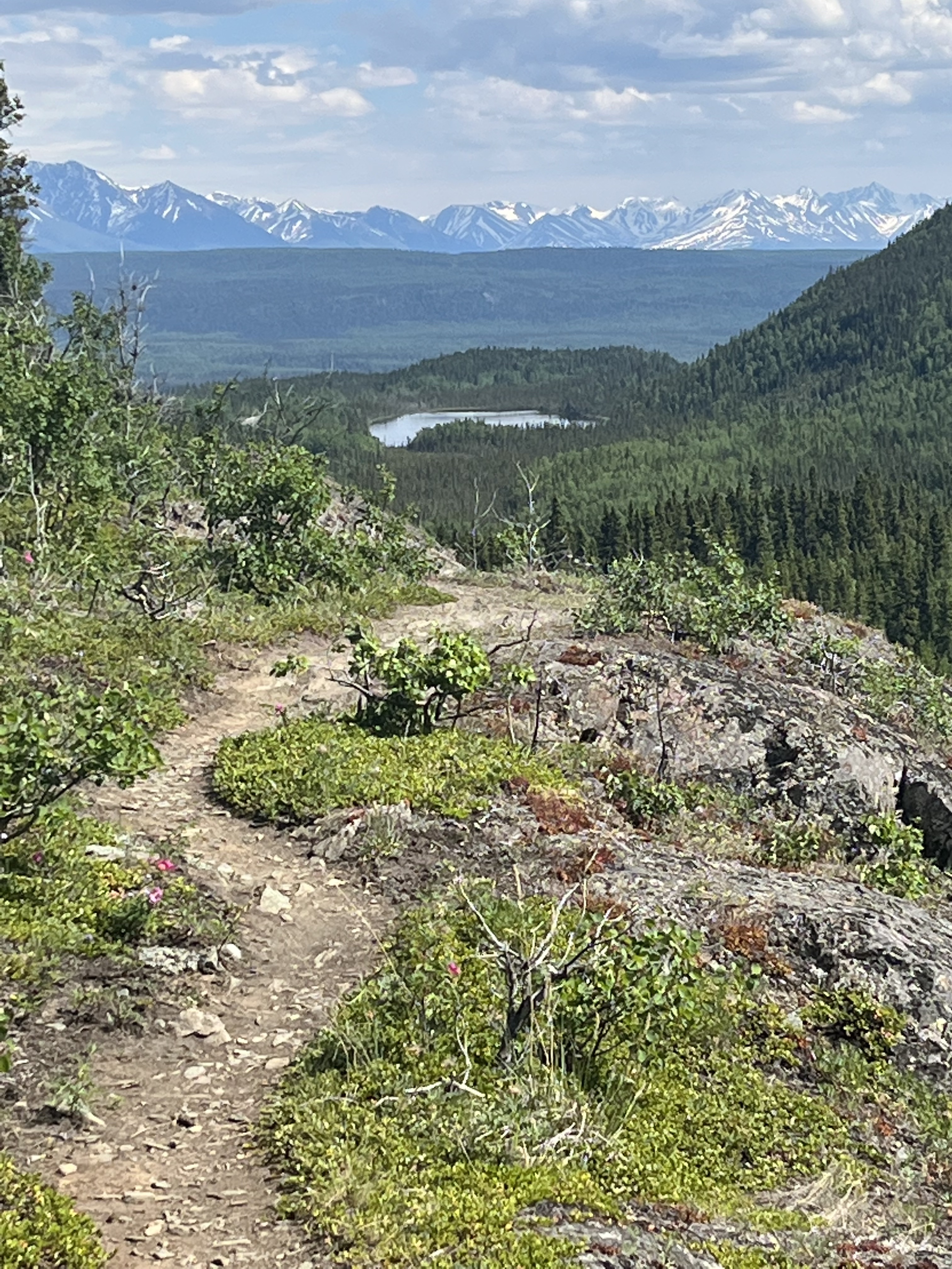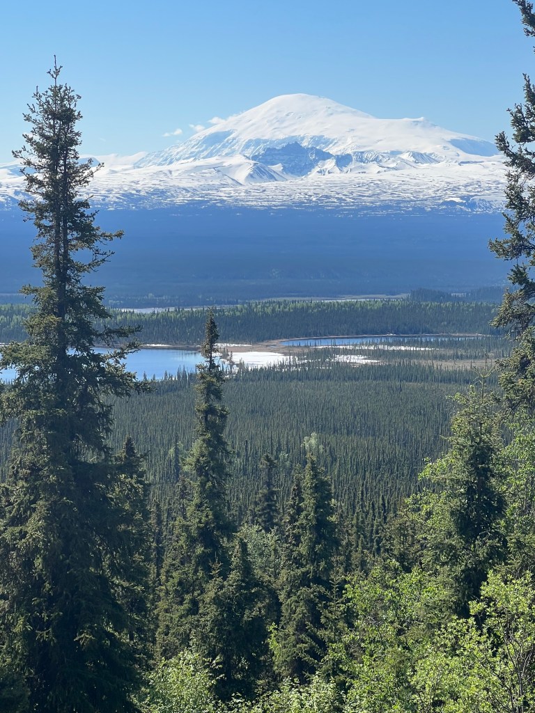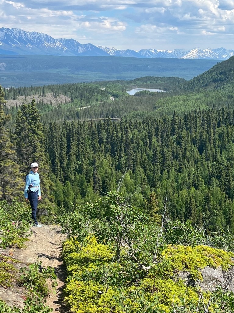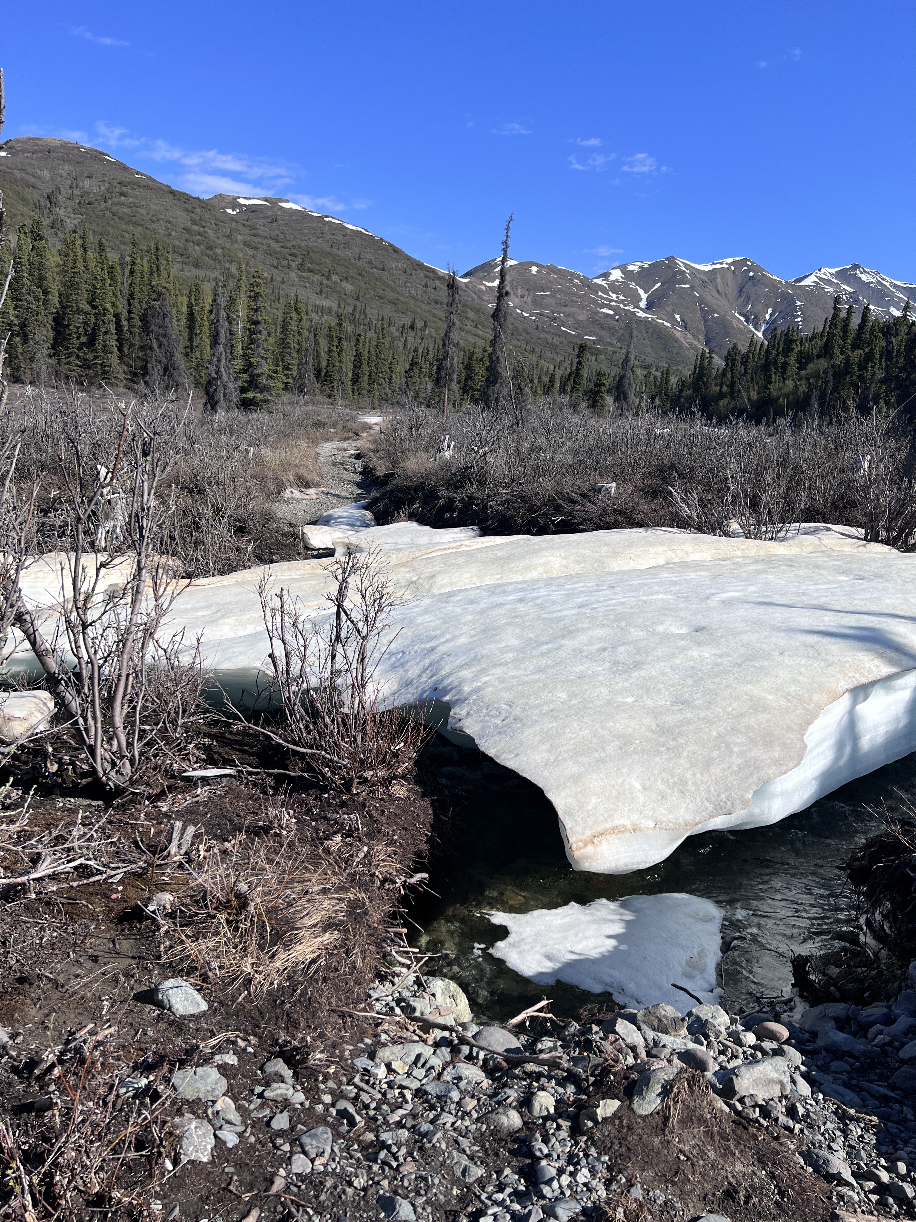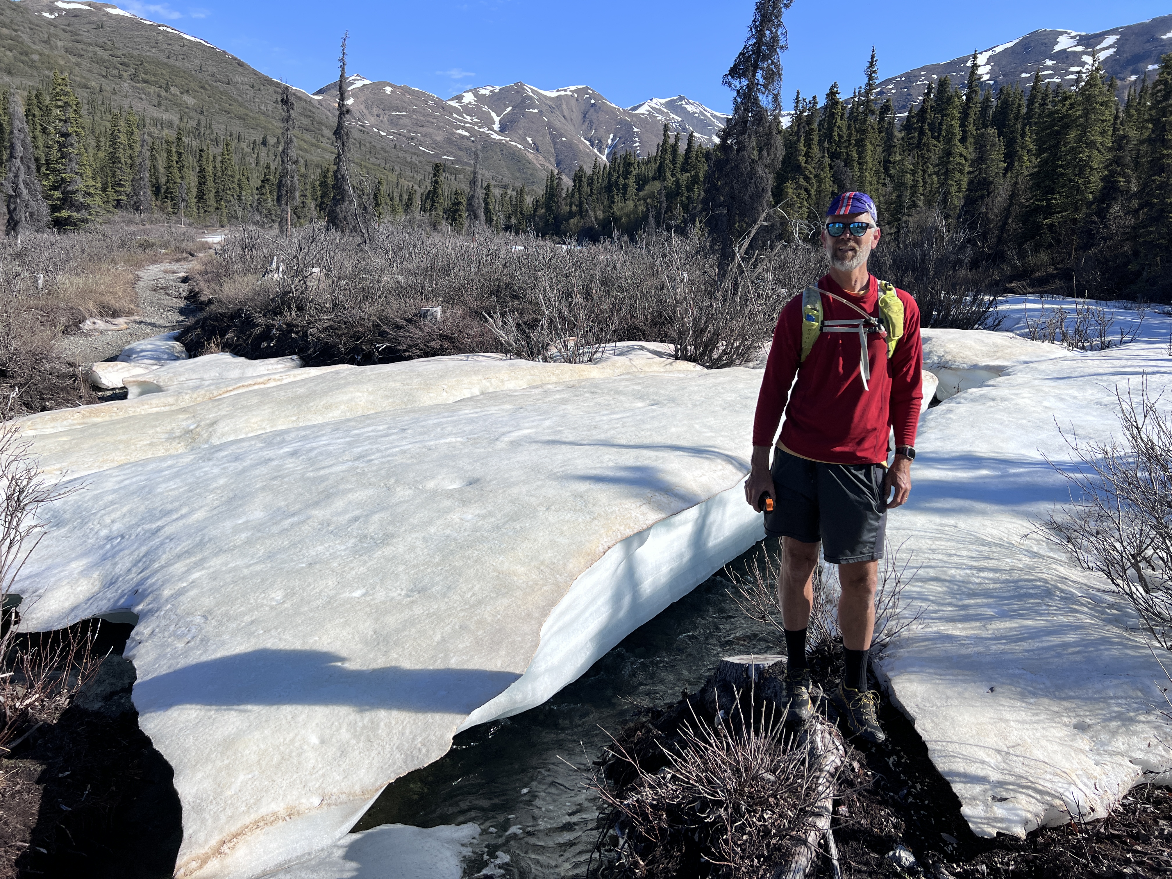 While on Nebesna Road we tackled the Caribou Crossing trail but found the creek crossing was still covered in ice. Still, our very remote three mile hike gave us a good look at the landscape.