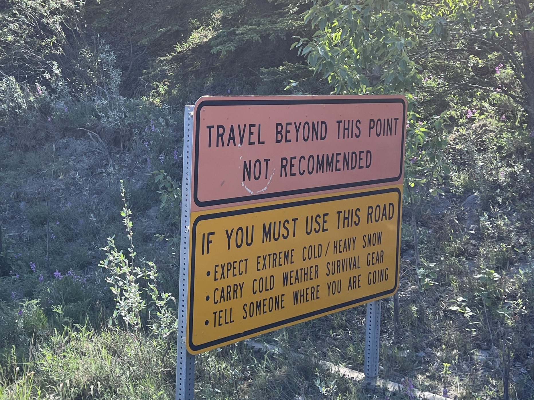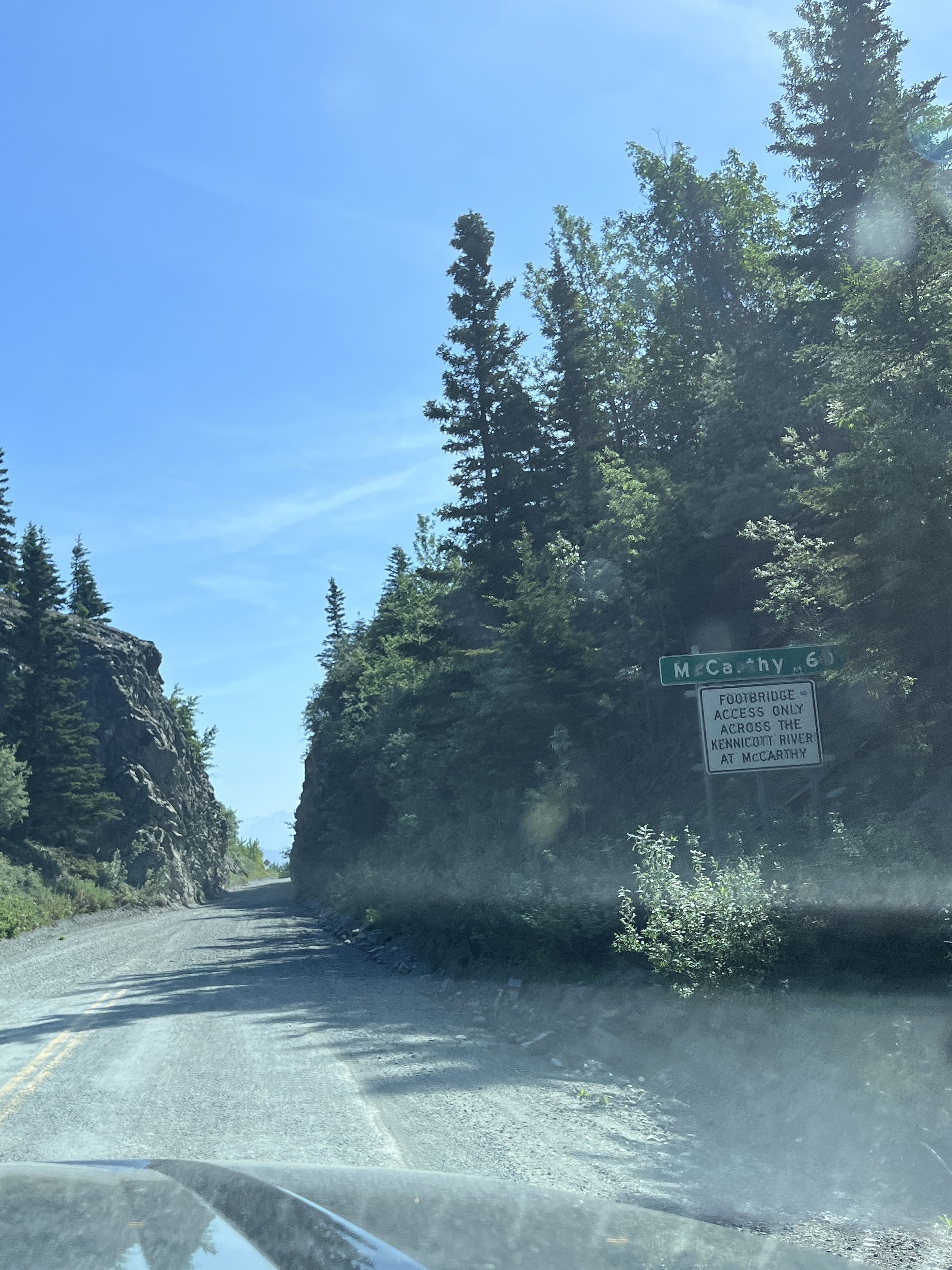 Finally we began the epic journey down the McCarthy Road, the second road into Wrangell St. Elias National Park. The road was created on the old railroad bed that linked the Kennecott Copper mine to the coast at Cordova. It’s a 60 miles journey down a rough, unpaved, and remote road that was originally developed in the early 1900s. Signs along the way warned us to be careful!