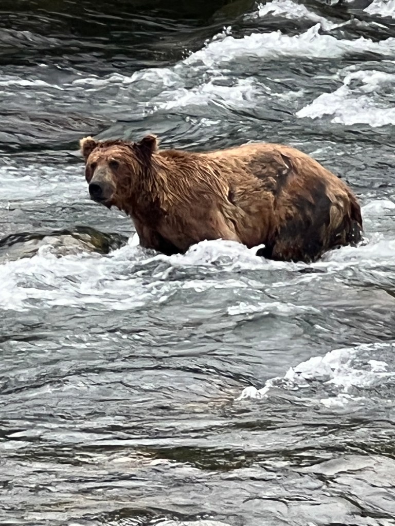 From there we walked across the Brooks River and had to stop our progress to let another big one pass by.