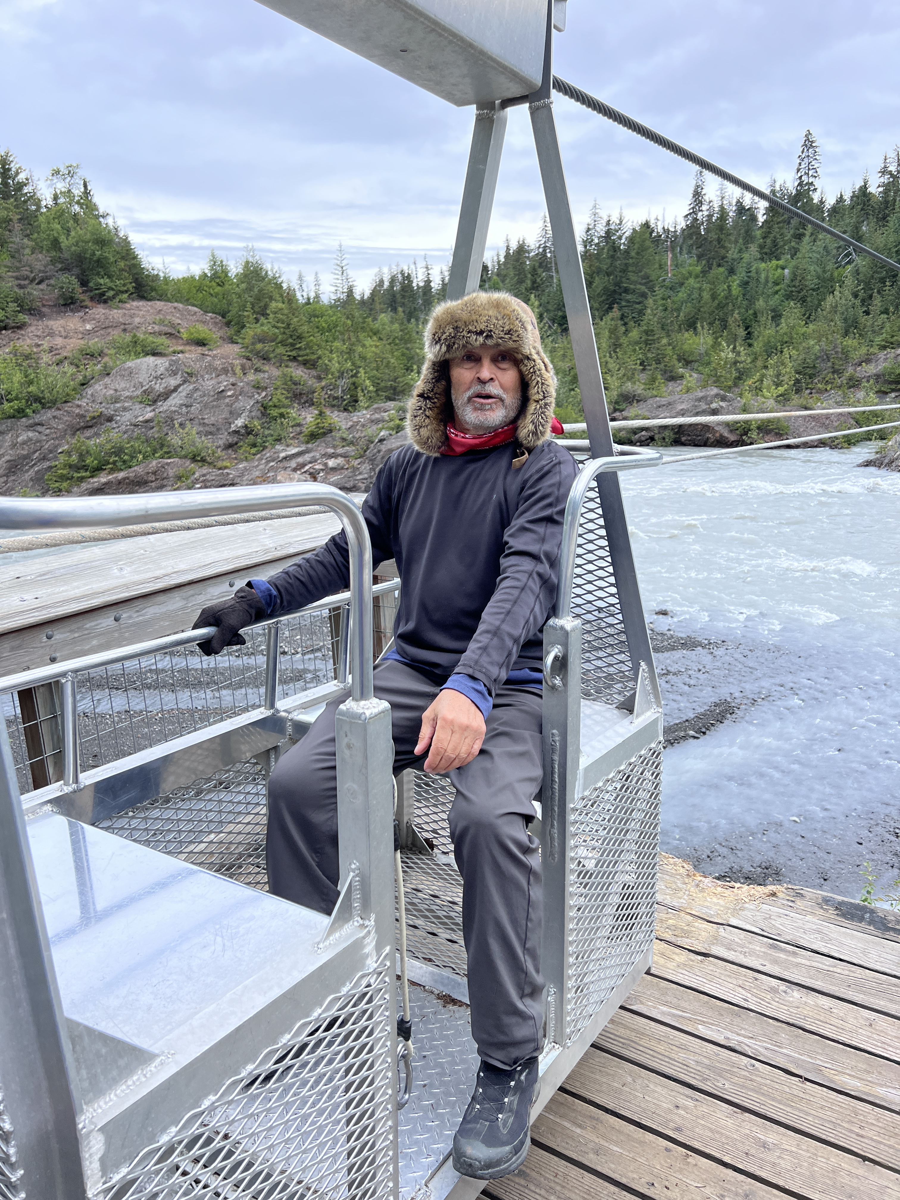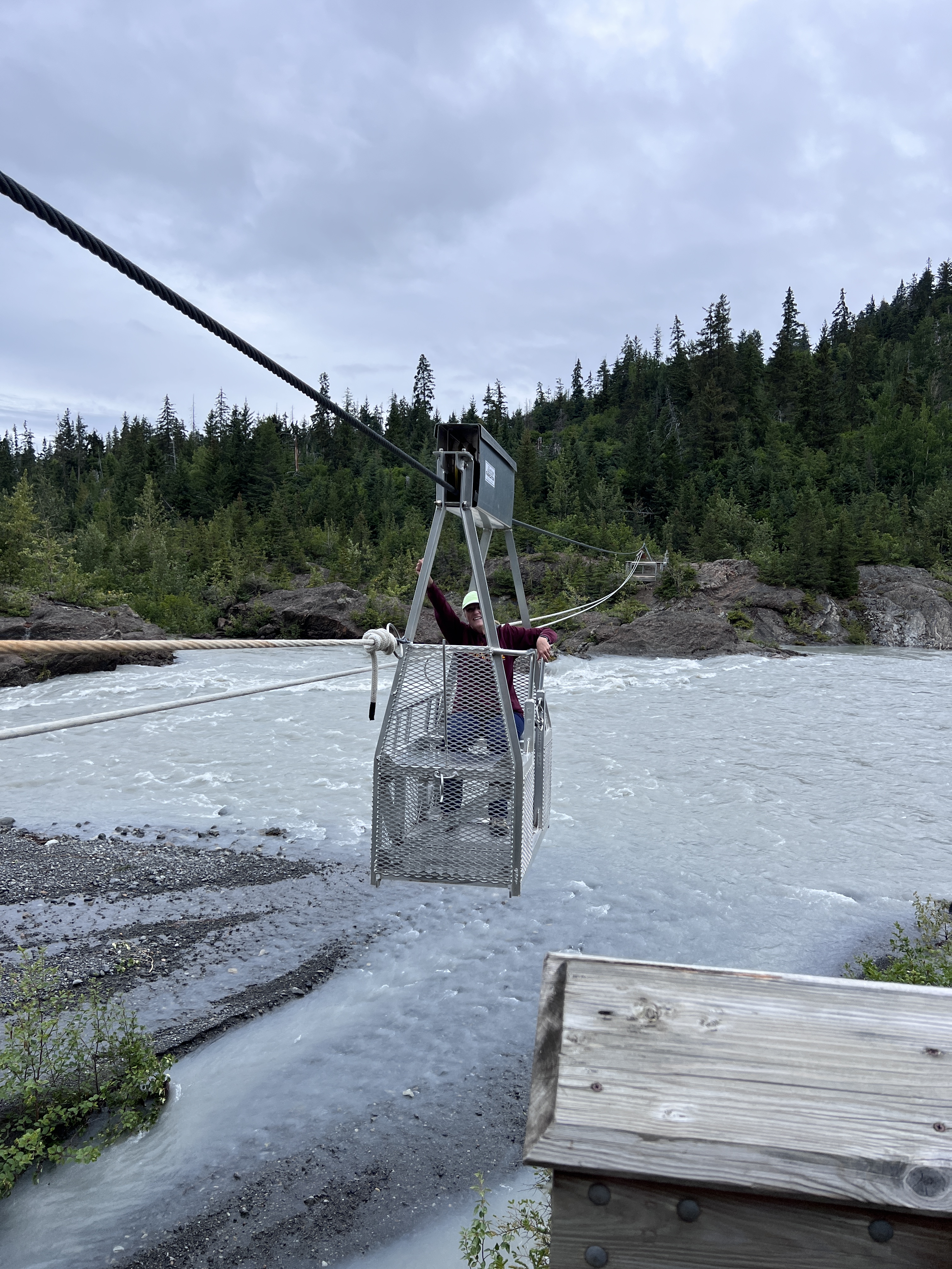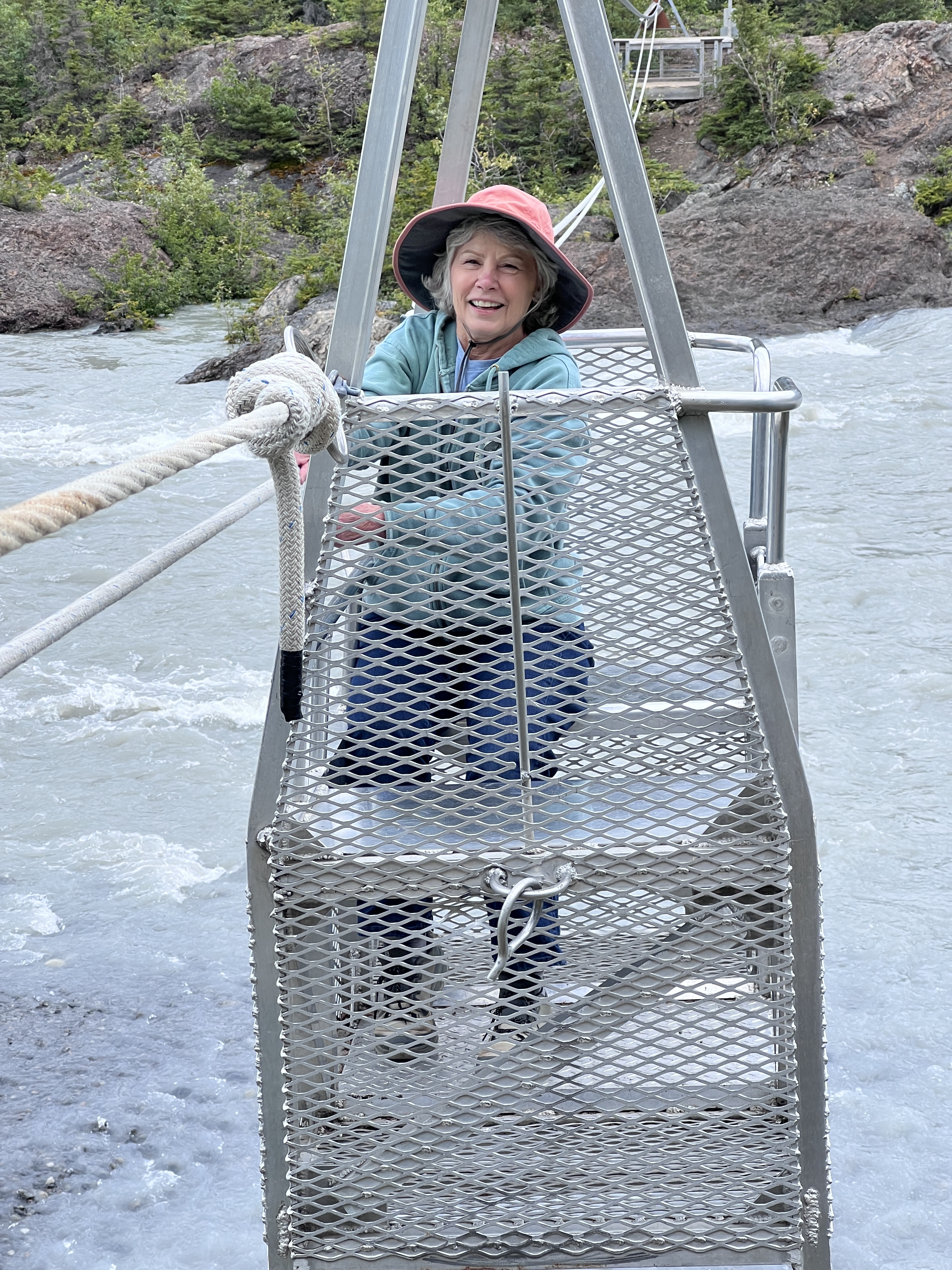 First we hiked to the tram, which is used to transport hikers across the roaring river. The tram is operated by hand and thank goodness we had Sam to help us pull ourselves across. Peggy and I each went out over the water, but Sam passed on that adventure.