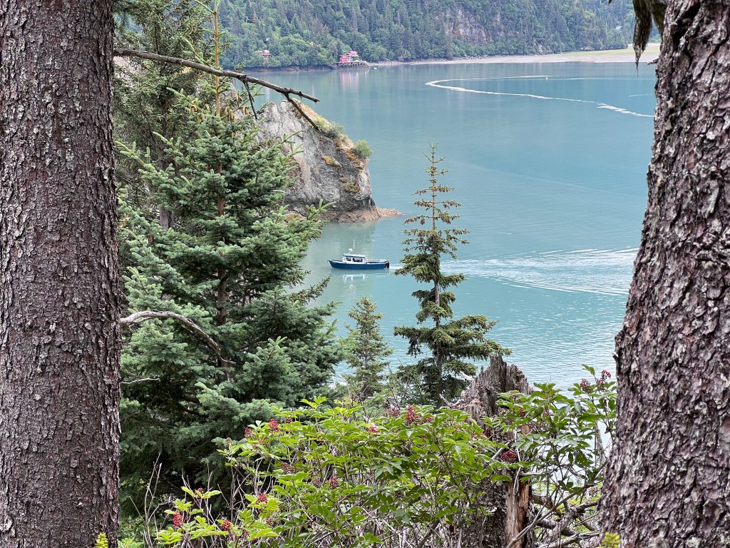 On another day, Peggy, Sam, and I set out on a small boat across the Bay to the trailhead for the Glacier Lake, Grewingk Tram, and Saddle Trails. We weren’t really sure what we were in for but…wow!
