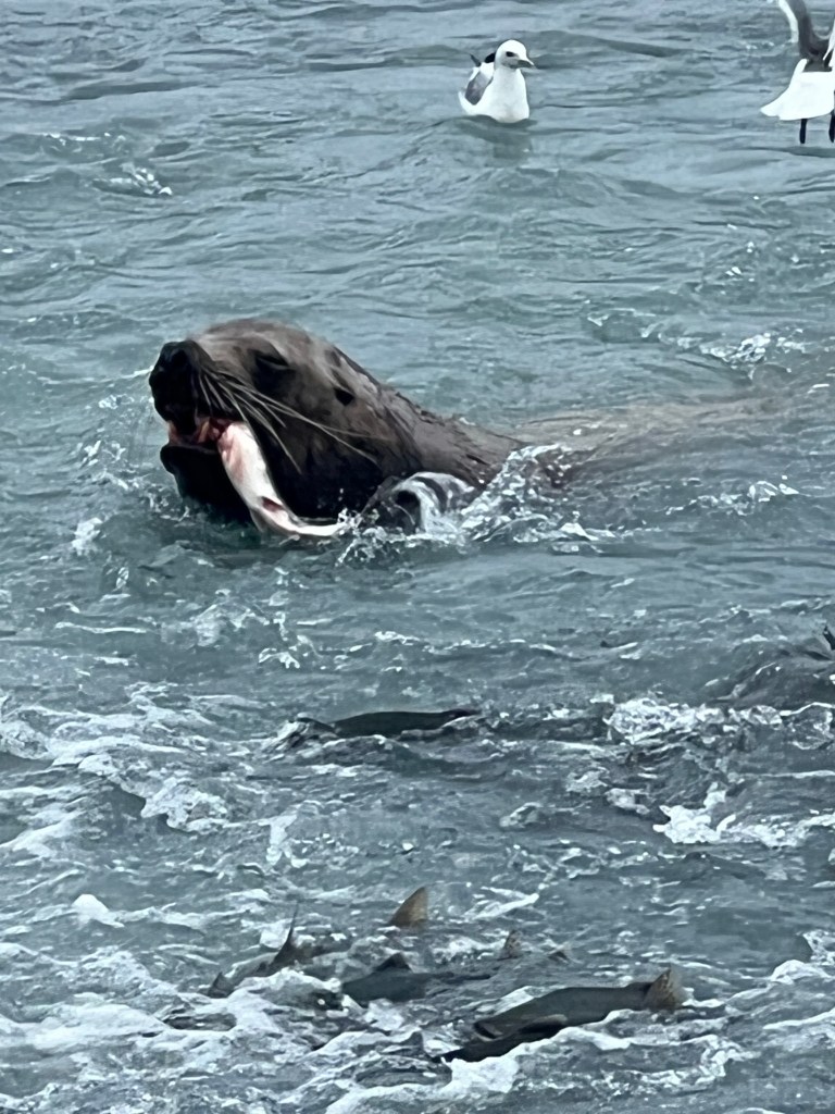 Across the harbor we visited the Solomon Gulch fish hatchery. Here, hundreds of thousands of silver salmon return to the hatchery each year. The mass of fish attract all kinds of other creatures including sea lions and bears. Watching this fat sea lion chow down on salmon was a highlight of our visit there.