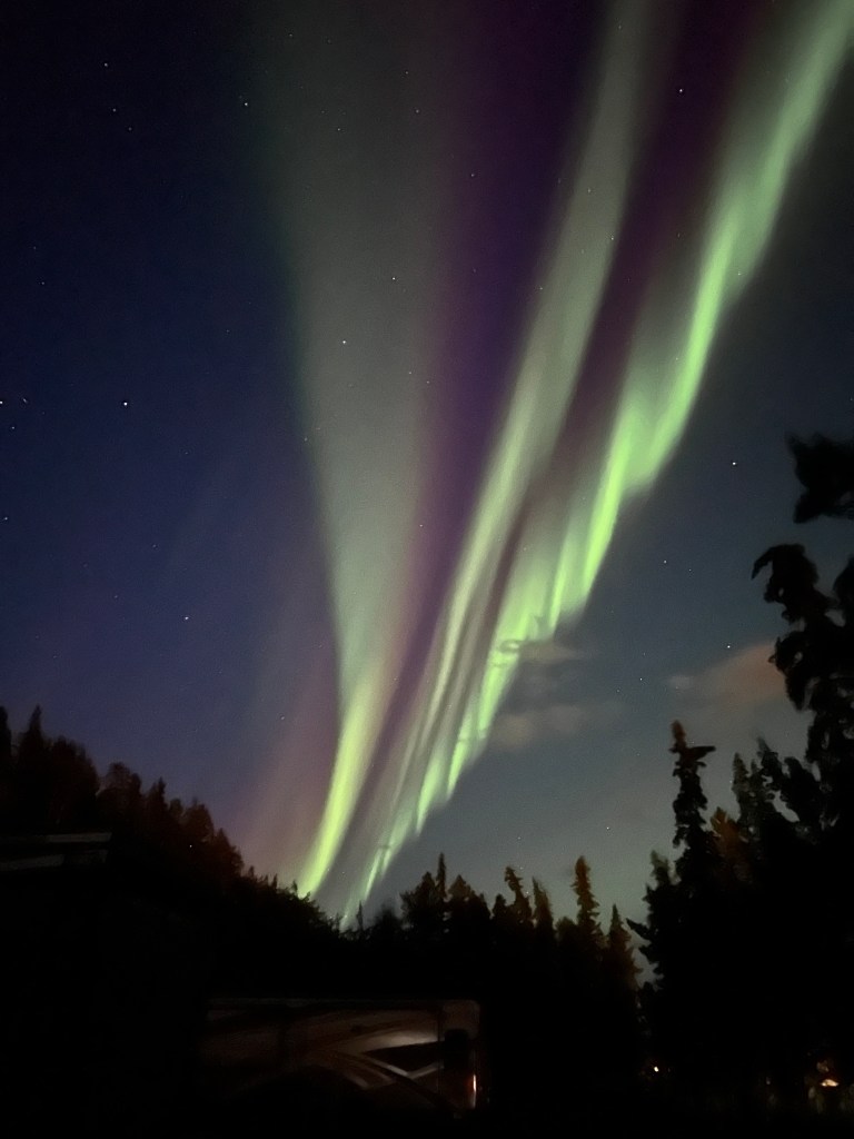 Seeing the northern lights – The Aurora Borealis has been on my list for decades, but we didn’t really think we’d see them with so much daylight in the summer. Sometimes the best things happen when you least expect it. When our ferry to Skagway was cancelled we were re-routed through Whitehorse, Yukon. Steve just happened to look out the window at midnight and BAM! The lights were making their first appearance of the year and we caught it at just the right time. Breathtaking is just one word that comes to mind.