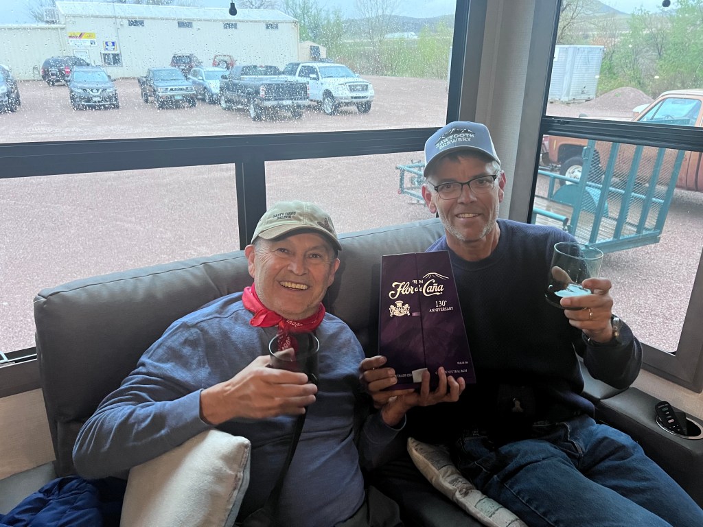 We’ve already towed the trailer over 1400 miles with a quick visit with Sam in Castle Rock, Colorado. Dinner and some Flor de Caña made for a fun, rainy evening.