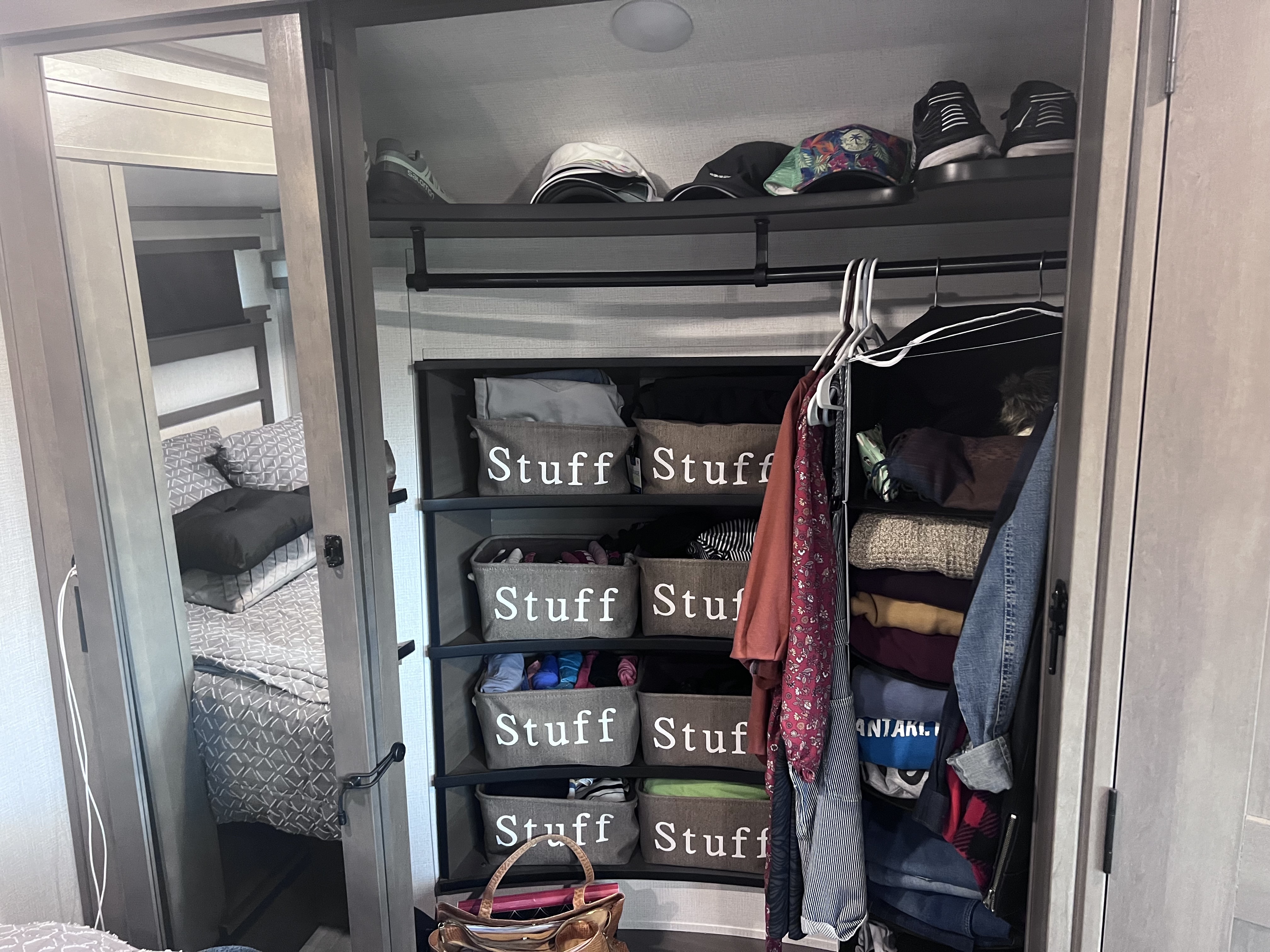 The new trailer has a washer and dryer, full-sized refrigerator, and an on-demand hot water heater. The king-sized bed is also an upgrade from our last trailer.