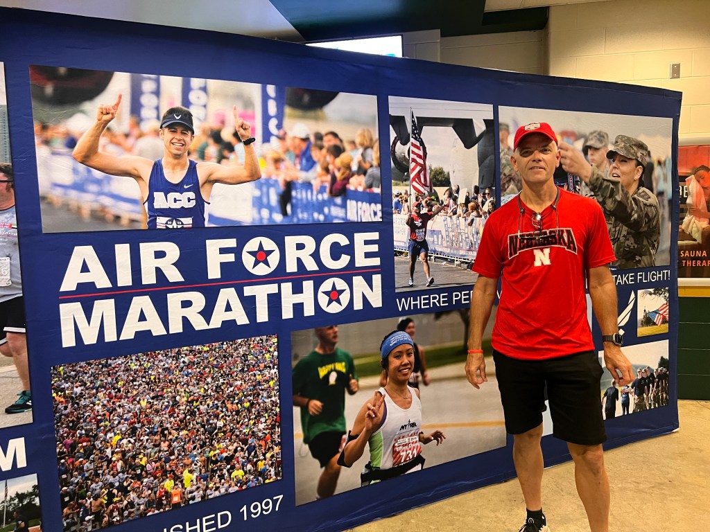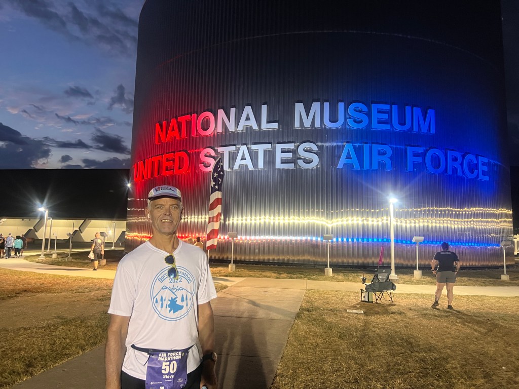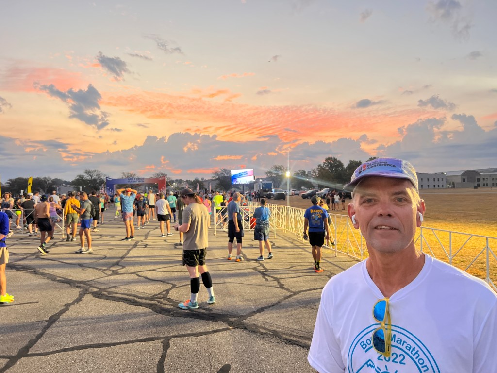 The marathon events began with an expo where we picked up Steve’s packet and took some fun photos. Early the next morning we arrived to the start line on the Air Force base in very warm weather. It was in the 70s at the start.