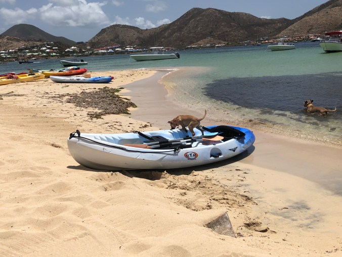We spent the day swimming, people watching, and just chillin’. We were even entertained by dogs that arrived by boat with other beach goers and enjoyed running free. The photo above shows a cute puppy playing on our kayak.